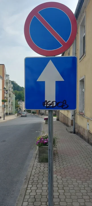 "Dzieła" na znakach drogowych i skrzynce gazowej zostały zgłoszone do Straży Miejskiej. Choć sztuka uliczna potrafi zachwycać, w tym przypadku trudno mówić o artystycznym sukcesie.