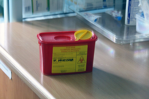 Nie tylko zużyte igły muszą być przechowywane w specjalnych pojemnikach. Także inne odpady medyczne, które nie są ostre (np. opatrunki) wyrzucane są do specjalnych czerwonych worków.