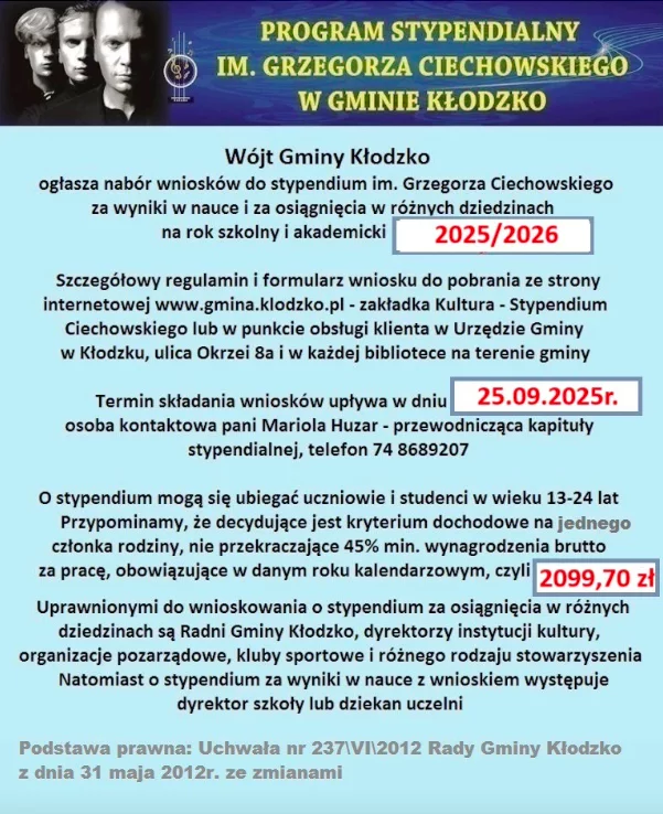 To propozycja dla młodych, ambitnych i zaangażowanych. Gmina Kłodzko po raz kolejny rusza z naborem do Programu Stypendialnego im. Grzegorza Ciechowskiego — prestiżowego wyróżnienia, które od lat wspiera utalentowanych uczniów i studentów z terenu gminy.