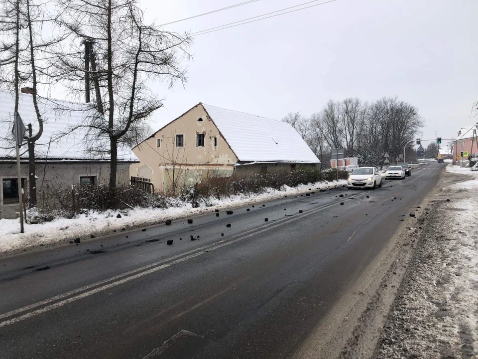 Gmina Kłodzko. Dzisiaj (tj. wtorek, 13 grudnia) około godz. 10:30 w Gołogłowach kierowca „zgubił” pół tony węgla - „czarne złoto” wysypało się z samochodu.