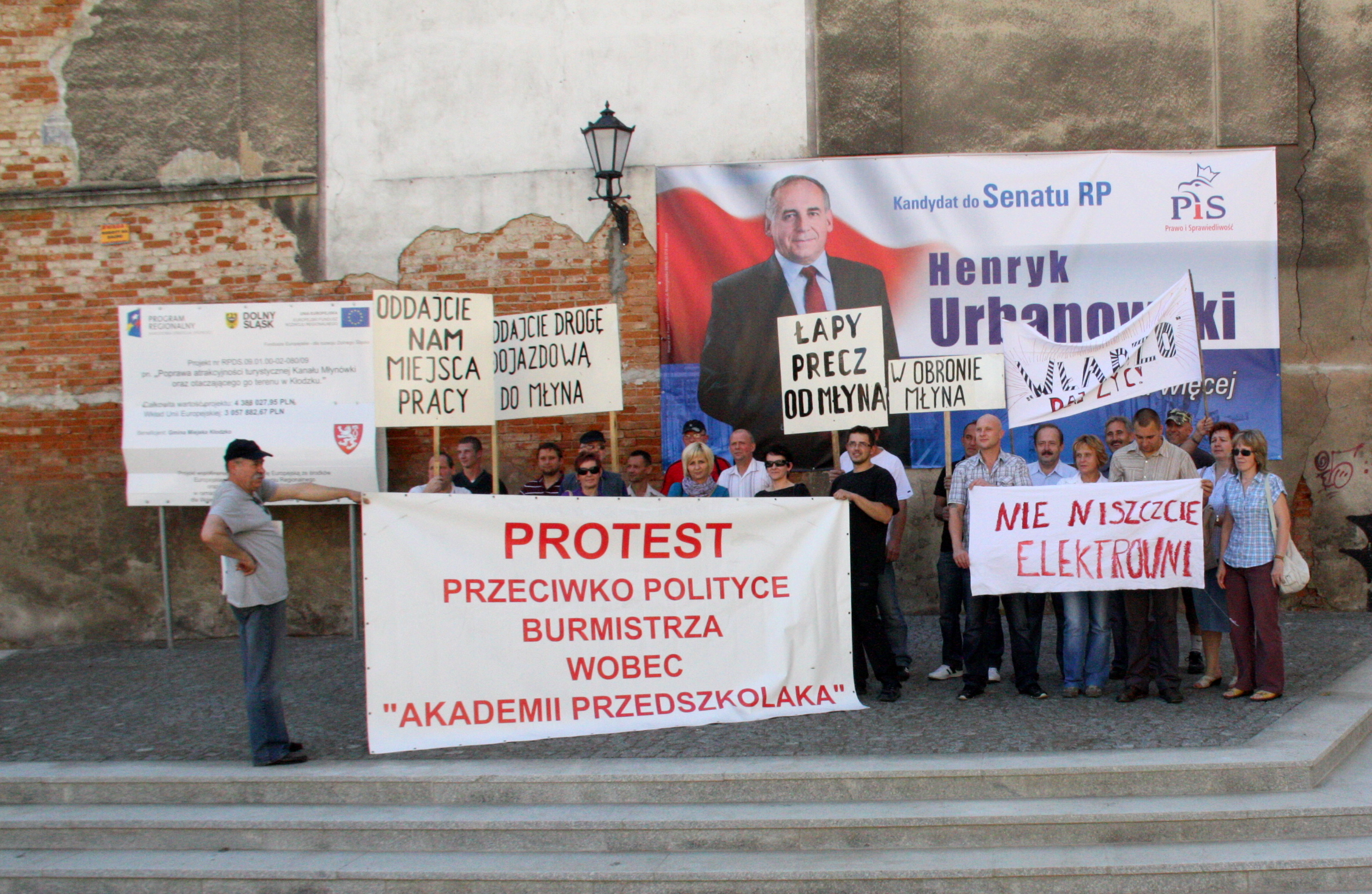 Kilkudziesięciu kłodzczan protestowało w piątek podczas oficjalnego otwarcia przystani gondolowej w Kłodzku.