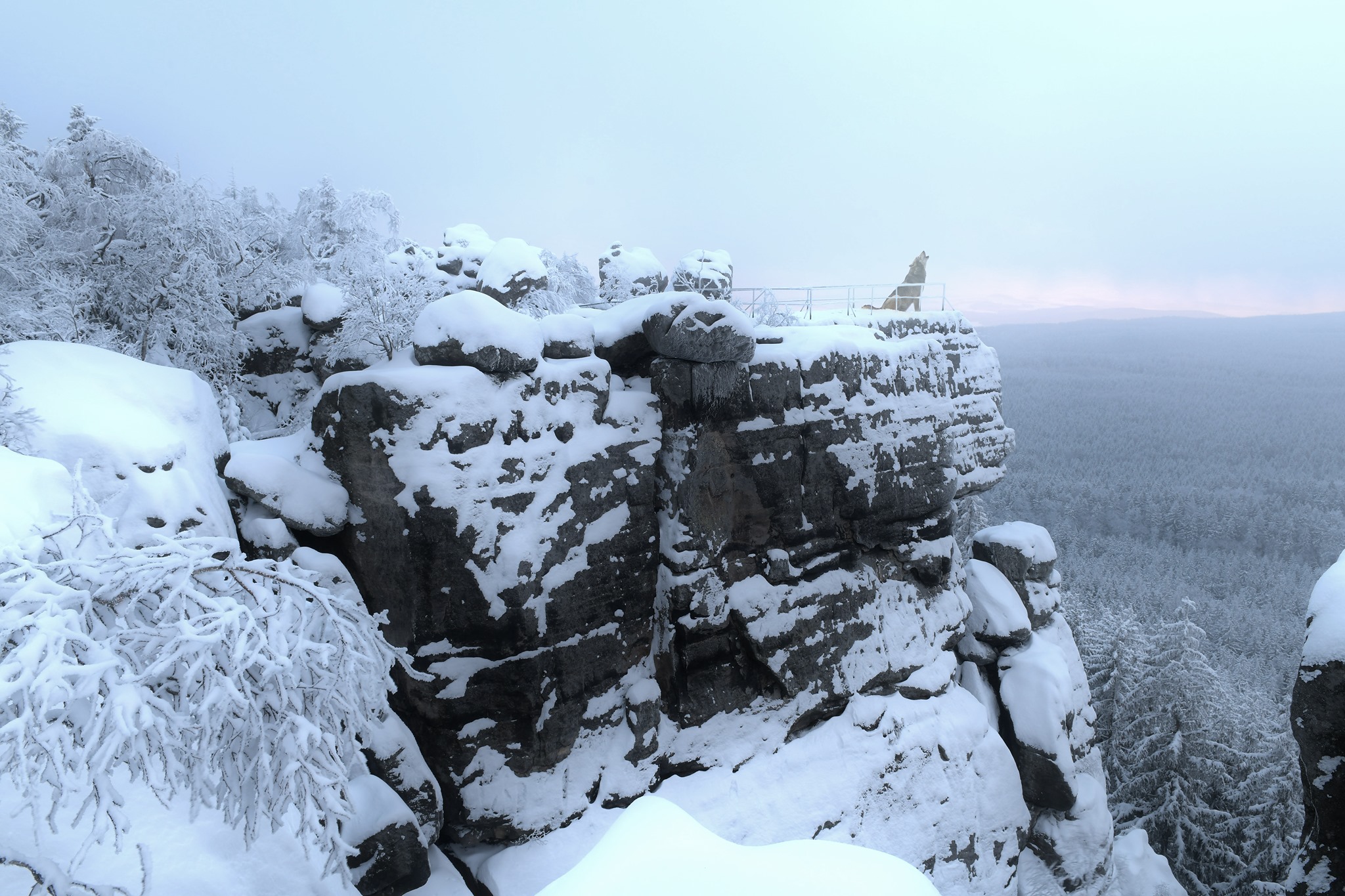 Na niebieskim szlaku Lisia Przełęcz - Skały Puchacza zamontowano metalowe schody, które prowadzą kilka metrów w dół. Następnie należy kierować się wzdłuż skalnej ściany w lewo.