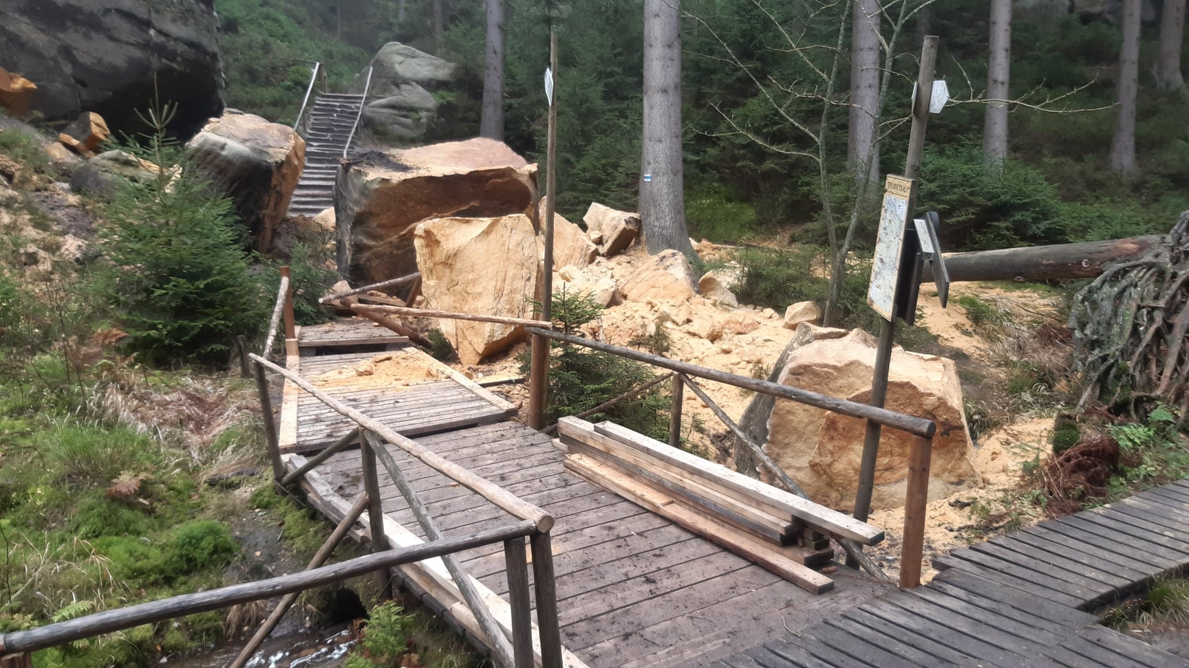 Góry Stołowe. W Teplickim Skalnym Mieście na popularnym szlaku w Dolince Anenskiej doszło do obrywu. Jak poinformowali członkowie Studenckiego Koła Przewodników Sudeckich we Wrocławiu, skały spadły na ścieżkę. Zamknięty jest odcinek między punktami "U Bašty" i "Krápníky". Do każdego z nich można dojść od strony horolezeckiej chaty, jednak nie da się zrobić całej pętli. Można przejść z niebieskiego na zielony szlak.