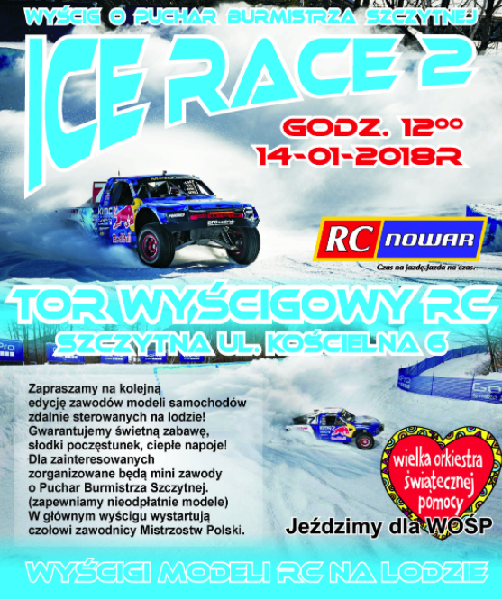 Zawody modeli samochodów zdalnie sterowanych na lodzie! Gwarantujemy świetną zabawę, słodki poczęstunek i ciepłe napoje. Dla zainteresowanych zorganizowane będą mini zawody o Puchar Burmistrza Szczytnej (dostępne będą nieodpłatnie modele). W głównym wyścigu wystartują czołowi zawodnicy Mistrzostw Polski.