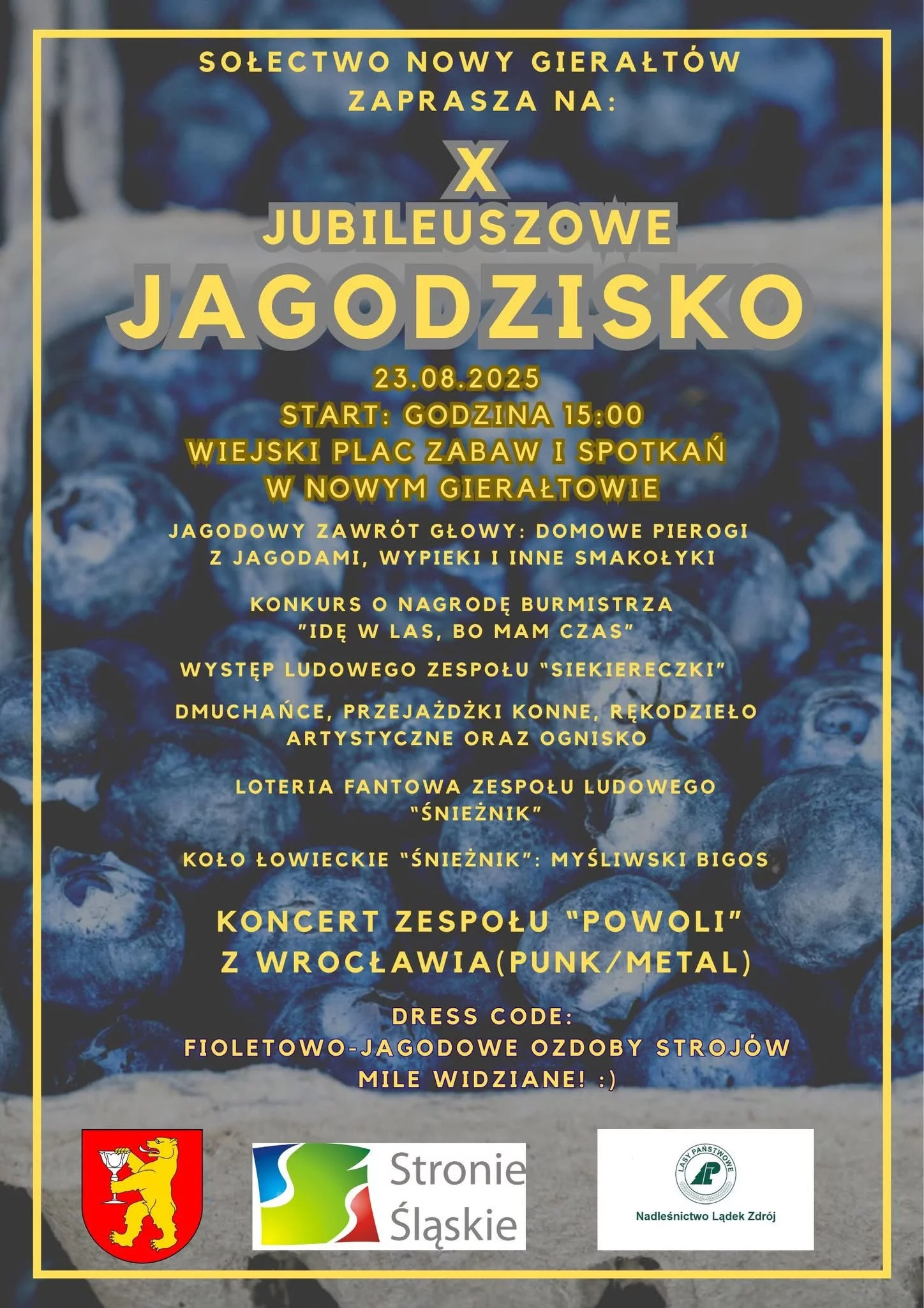 Sierpień w gminie Stronie Śląskie upływa pod znakiem festynów, dobrej zabawy i wyjątkowych smaków. W sobotę, 23 sierpnia mieszkańcy i goście spotkają się w Nowym Gierałtowie na wyjątkowym wydarzeniu – X Jubileuszowym Jagodzisku. Start imprezy zaplanowano na godz. 15:00 na wiejskim placu zabaw i spotkań.