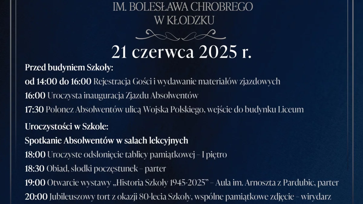 Już dziś (sobota, 21 czerwca) Kłodzko stanie się miejscem niezwykle wzruszającego i ważnego wydarzenia dla lokalnej społeczności. Z okazji 80-lecia I Liceum Ogólnokształcącego im. Bolesława Chrobrego odbędzie się Zjazd Absolwentów, który zgromadzi wielu dawnych uczniów tej legendarnej szkoły.