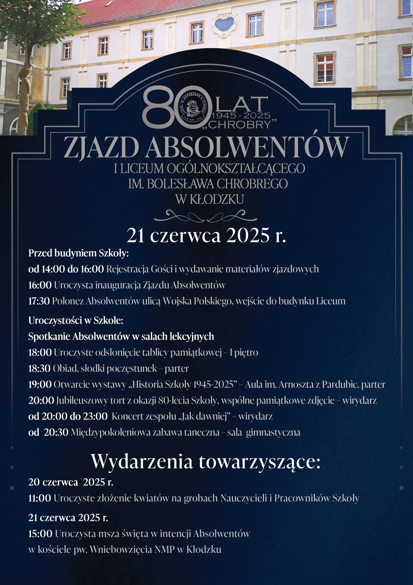 Świętowanie 80-lecia „Chrobrego" to nie tylko sobotni zjazd. Już 20 czerwca o godzinie 11:00 na grobach nauczycieli i pracowników szkoły zostaną złożone kwiaty. Natomiast 21 czerwca o godz. 15:00 odbędzie się uroczysta msza święta w intencji absolwentów w kościele pw. Wniebowzięcia NMP w Kłodzku.
