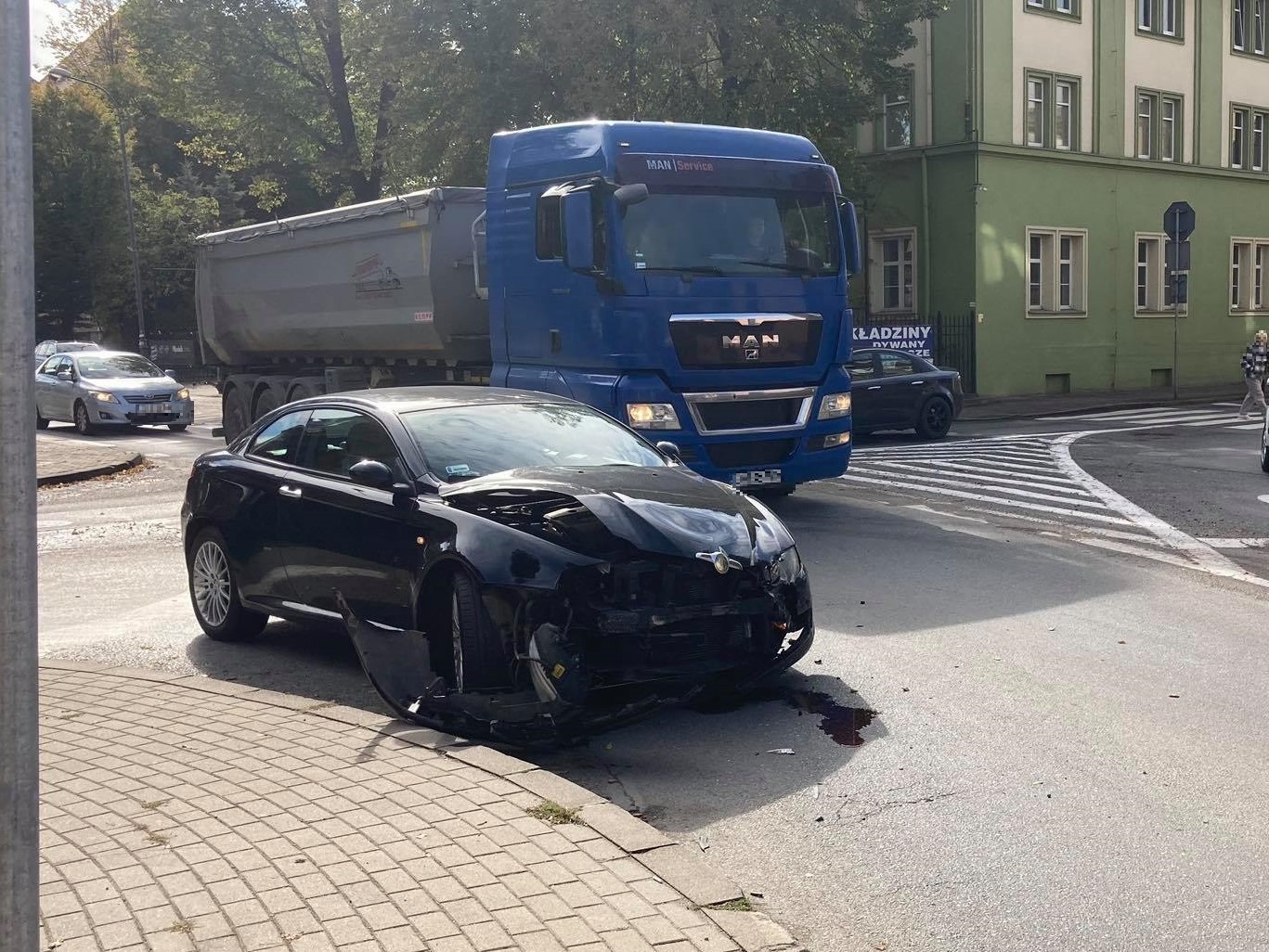 Kłodzko. We wtorek, 12 października, około godz. 13:00 przy zbiegu ulic Grunwaldzkiej, Witosa i Łużyckiej doszło do kolizji. Z wstępnych ustaleń wynika, że kierująca Alfą Romeo kobieta nie ustąpiła pierwszeństwa ciężarówce i doprowadziła do zderzenia - Zasadniczo wjechała w przejeżdżającą ciężarówkę i uderzyła w koła naczepy. - relacjonują świadkowie. Na szczęście nikomu nic się nie stało.