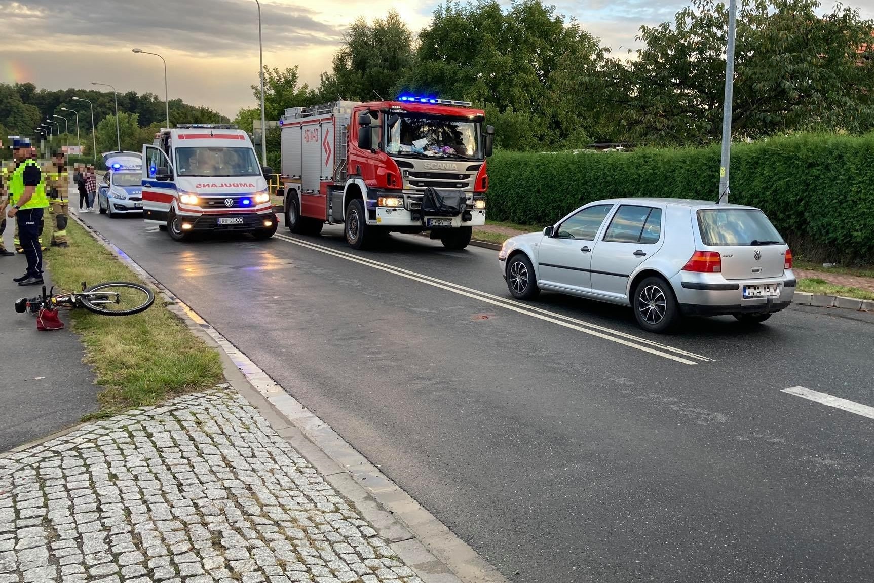 Na miejscu natychmiast pojawiły się służby - policja, straż pożarna oraz Zespół Ratownictwa Medycznego. Rowerzysta prawdopodobnie doznał urazu głowy.