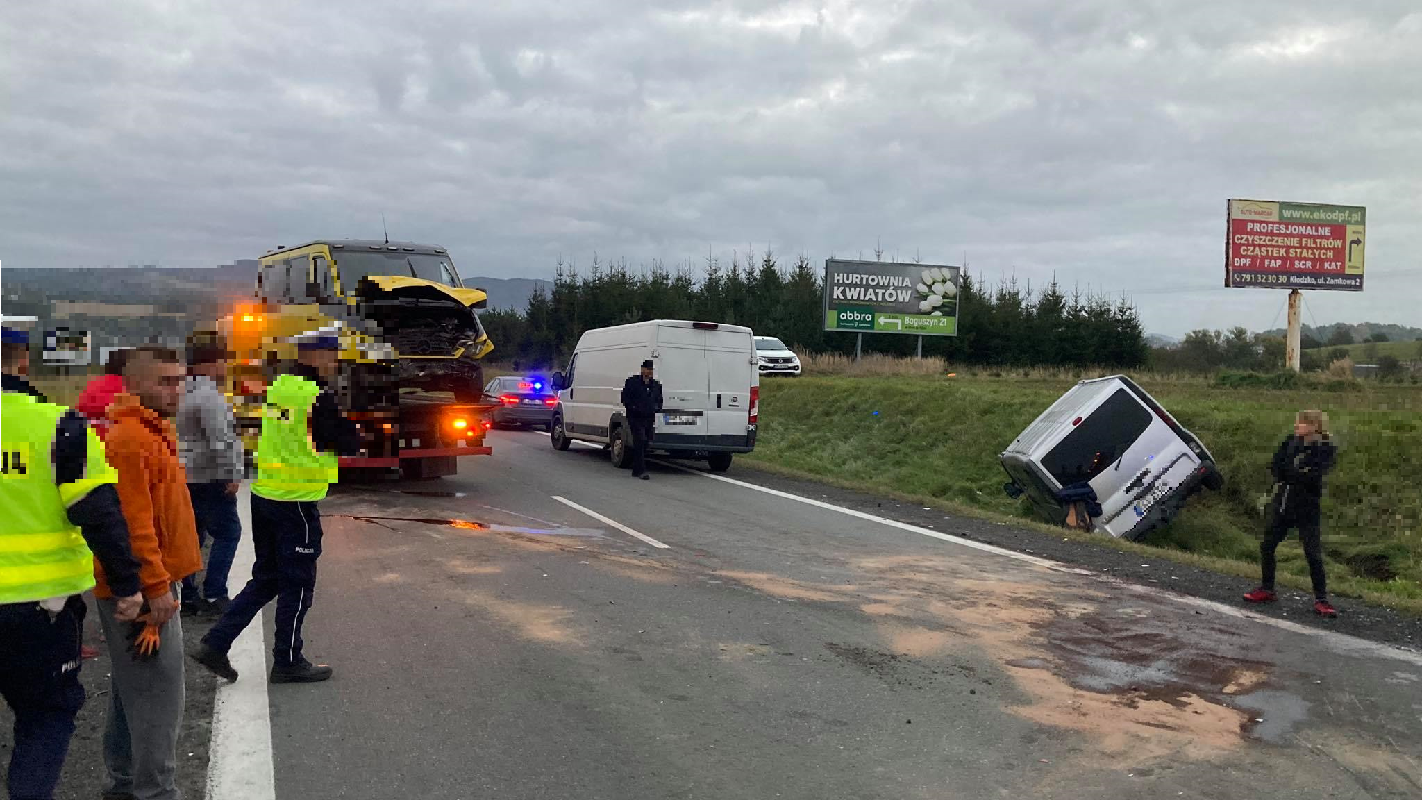 Droga przez kilka godzin była zablokowana. Poszkodowane zostały cztery osoby, dwie z nich zostały przewiezione do szpitala. Auta zostały odholowane na policyjny parking.