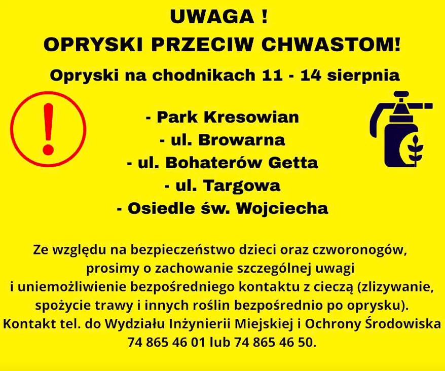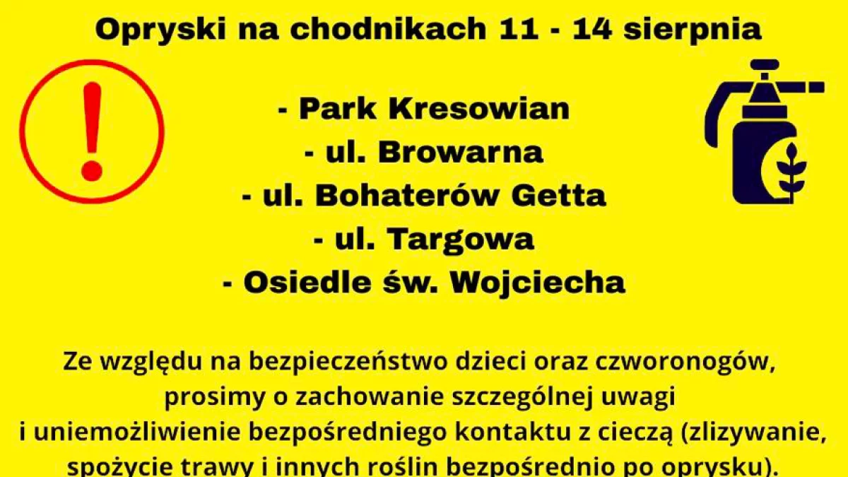 W dniach 11–14 sierpnia na terenie miasta realizowane są zabiegi oprysku przeciw chwastom, obejmujące m.in.: Park Kresowian, ul. Browarną, ul. Bohaterów Getta, ul. Targową, a także Osiedle św. Wojciecha.