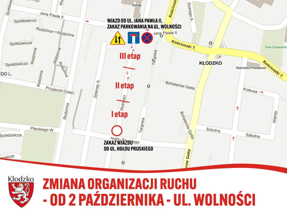 2 października rozpocznie się remont ul. Wolności w Kłodzku. Aby ułatwić funkcjonowanie mieszkańcom posesji przy tej ulicy, prace podzielono na trzy etapy. Pierwszy z nich będzie obejmował odcinek około 120 metrów od ulicy Hołdu Pruskiego (będzie to odcinek całkowicie wyłączony z ruchu). Na pozostałej części ul. Wolności obowiązywać będzie zakaz zatrzymywania się. Wjechać na ulicę będzie można od strony ul. Jana Pawła II (dojazd dla mieszkańców i służb miejskich). Na otwartych odcinkach obowiązywać będzie ruch dwustronny.