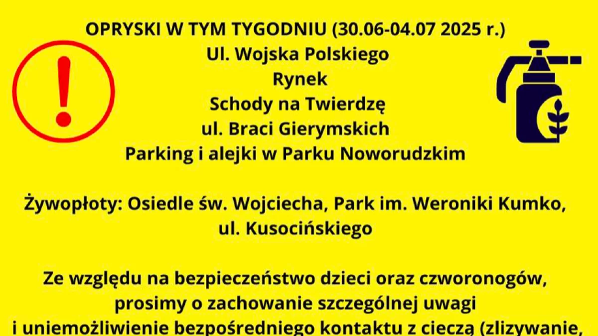 Władze miasta Kłodzka informują, że od 30 czerwca do 4 lipca przeprowadzane będą opryski przeciw chwastom na wybranych terenach miejskich. Celem działań jest utrzymanie porządku i estetyki przestrzeni publicznych, jednak mieszkańcy proszeni są o zachowanie szczególnej ostrożności, szczególnie rodzice małych dzieci oraz właściciele zwierząt.