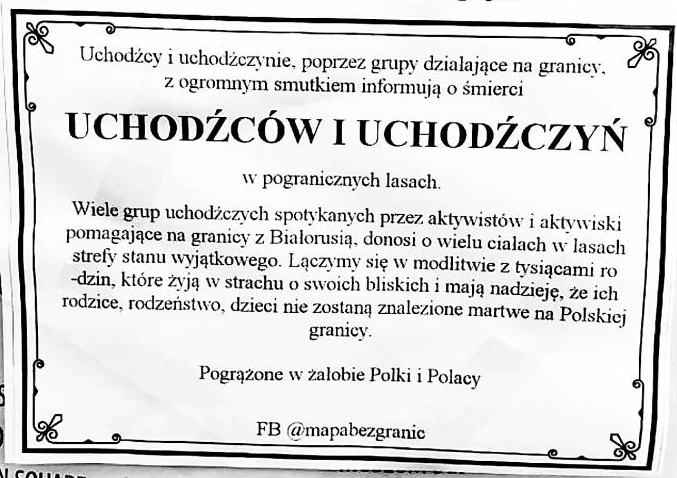- Z żalem zawiadamiamy, że 20.09.21 znaleziono zwłoki Uchodźcy w powiecie sokólskim, w polu. (...) Łączymy się w modlitwie z tysiącem rodzin żyjących nadzieją, że nie jest to ich syn, brat lub ojciec – można było przeczytać na jednej z nich.