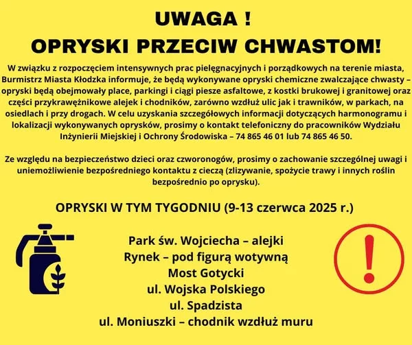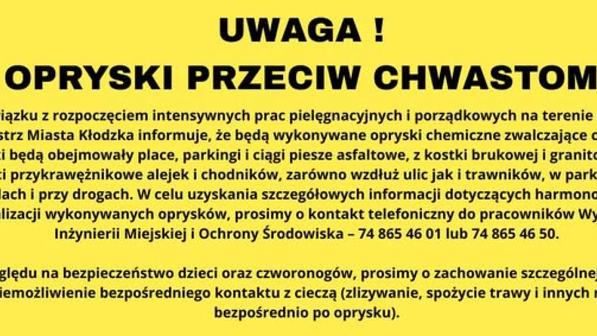 Urzędnicy apelują o zachowanie ostrożności – szczególnie w przypadku dzieci i zwierząt. Kontakt ze świeżo opryskanymi roślinami może być niebezpieczny, dlatego warto unikać bezpośredniego dotyku trawy i innych miejsc objętych zabiegami.