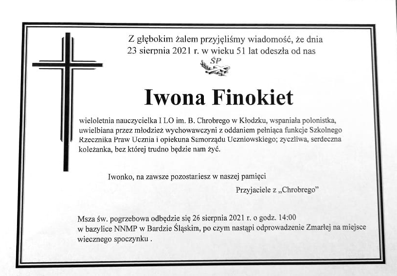 Kłodzko. Nie żyje Iwona Finokiet - wieloletnia nauczycielka w Liceum Ogólnokształcącym im. Bolesława Chrobrego w Kłodzku. Była polonistką, uwielbianą przez młodzież. Z oddaniem pełniła funkcję szkolnego rzecznika praw. Ucznia i opiekuna Samorządu Uczniowskiego. Miała zaledwie 51 lat. Msza pogrzebowa odbędzie się 26 sierpnia o godz. 14.00 w bazylice w Bardzie.