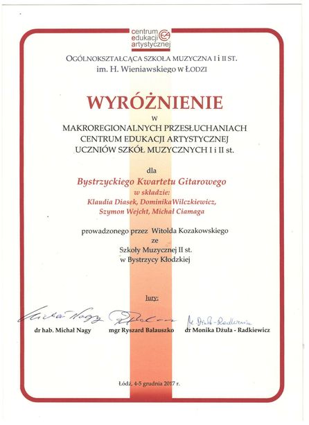 W Łodzi odbyły się obowiązkowe Makroregionalne Przesłuchania Centrum Edukacji Artystycznej. Grudniowe wydarzenie okazało się pomyślne dla Bystrzyckiego Kwartetu Gitarowego. Uzyskał on wyróżnienie, osiągając ocenę 22,33 pkt. Zdaniem fachowca, tj. dyrektora Szkoły Muzycznej II st. w Bystrzycy Kłodzkiej Tadeusza Piotrowskiego - występ i umiejętności okazały się bardzo dobre.