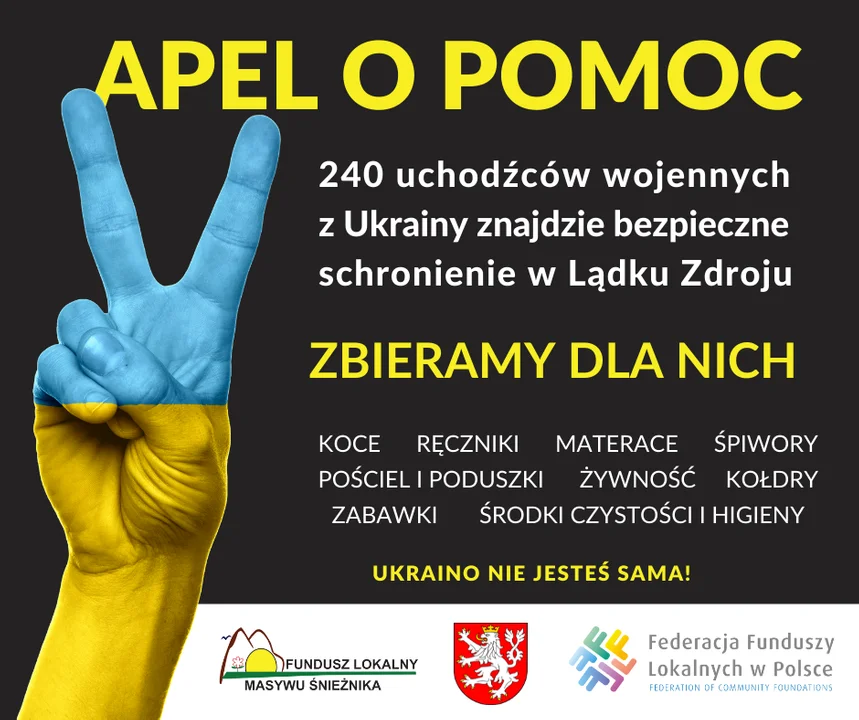 Burmistrz Roman Kaczmarczyk zaoferował 240 miejsc noclegowych dla uchodźców z Ukrainy. Fundusz Lokalny Masywu Śnieżnika we współpracy z Homo Faber z Lublina koordynuje działania związane z transportem i noclegami. Pomaga takżew organizowaniu bieżącej adaptacji i pomocy. Udziela również innego wsparcia niezbędnego do zapewnienia bezpiecznego i godnego życia w Polsce. W związku z tym Fundusz Lokalny Masywu Śnieżnika organizuje zbiórkę rzeczy, które są w tym momencie najbardziej potrzebne: materace, ręczniki, pościel, kołdry i poduszki, śpiwory, środki czystości i do prania, środki higieny dla dzieci i dla kobiet, pampersy, żywność długoterminowa, zabawki dla maluchów, a także przybory szkolne.
