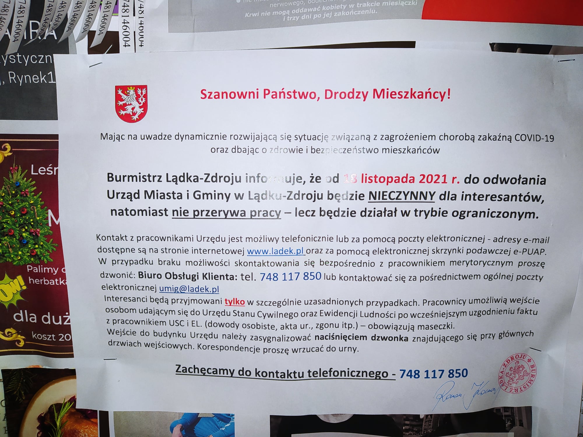Lądek-Zdrój. Od czwartku, 18 listopada, aż do odwołania Urząd Miasta i Gminy w Lądku-Zdroju jest nieczynny dla interesantów. W komunikacie możemy przeczytać, że decyzja o zamknięciu spowodowana jest dynamicznie rozwijającą się sytuacją związaną z koronawirusem. Kontakt z urzędnikami możliwy jest telefonicznie lub mailowo. Do budynku, po wcześniejszym umówieniu, mogą wejść osoby udające się do Urzędu Stanu Cywilnego lub Ewidencji Ludności.