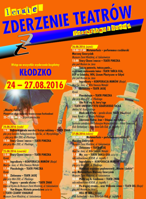 Po kilku latach nieobecności tego wydarzenia festiwal powraca z nową energią. Nie tylko sale teatralne, ale ulice, skwery, mosty a nawet stadion pięknego Kłodzka, wypełnią się międzynarodowym gwarem artystów i publiczności. Letnie Zderzenie, będzie fiestą teatrów ulicznych, „barwnym karnawałem” parad, szczudlarzy, bajkowych kostiumów, scenografii, muzyki i tańca. Miastem zawładnie fantazja plenerowych inscenizacji, czasem odważnych artystycznie, czasem klaunowsko – prześmiewczych. Zawsze jednak swoją urodą niezwyczajnych, lub po prostu pięknych, przyprawiających dzieci i dorosłych o przyspieszone bicie serca i jak najszerzej otwarte oczy. Pojawi się też okazja do zobaczenia młodego teatru, zarówno, w klasycznej czechowowskiej odsłonie („Plotki” Teatru Znak), jak i awangardowo – liturgicznej („Von Bingen...” Teatru Czarny Kwadrat). Oprócz realizacji aktorskich swój bezkompromisowy spektakl pokażą tancerze („My_szy” – GSA). Zderzenie letnie wymyśliliśmy też jako zdarzenie multidyscyplinarne. Bogactwo spektakli teatralnych, tanecznych, komediowych i klaunowskich dopełnią plastycy w akcji malarskiej „Miasto i ludzie", którzy wspólnie z tancerzami pokażą intrygujący „Teatr malowania tańca”. Świadectwem otwarcia się i odwagi artystycznej, będzie nie tylko inscenizacja teatralna na dziecińcu Muzeum Ziemi Kłodzkiej, ale także przez 2 festiwalowe dni publiczność oglądać będzie w tym miejscu akcję twórczą Marzeny Gawrysiak, niezwykle utalentowanej malarki i rzeźbiarki. Jej performance Mathamorfozis – dotykać będzie tożsamości miasta i jego historii. Koncepcja festiwalu jest nowa, ale także w oczywisty sposób nawiązuje do letnich działań artystycznych realizowanych w minionych latach przez ludzi skupionych wokół Mariana Półtoranosa i Michała Tramera. Nazwa zobowiązuje. Kluczem festiwalu, było dla nas zderzenie konwencji i gatunków – wystąpią teatry plenerowe i sceniczne, będą malarze, rzeźbiarze, tancerze i performerzy. Zderzymy zatem malarstwo z tańcem, powagę z głośnym śmiechem, styl wysoki z ludycznym i jak zwykle – artystów z publicznością (klub festiwalowy).