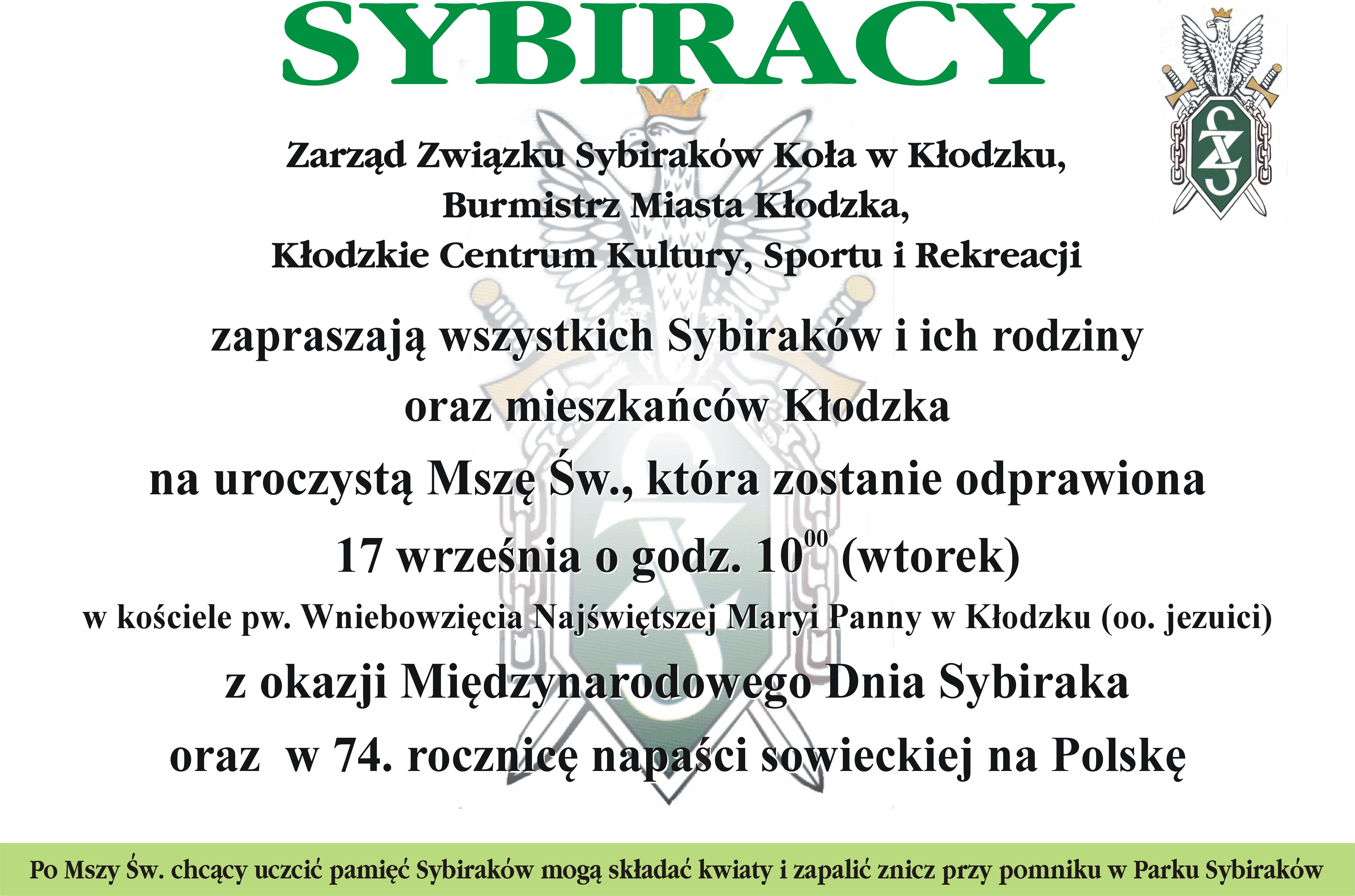Uroczysta Msza Święta zostanie odprawiona 17 września o godz. 10.00 (wtorek) w kościele pw. Wniebowzięcia Najświętszej Marii Panny w Kłodzku (oo. Jezuici) z okazji Międzynarodowego Dnia Sybiraka oraz w 74. rocznicę napaści sowieckiej na Polskę.