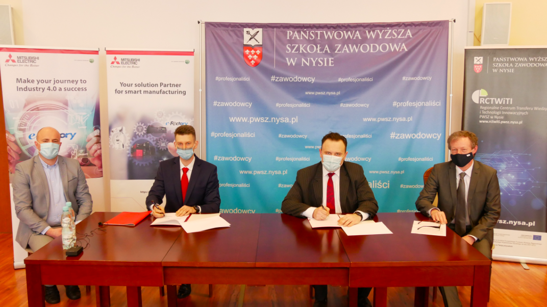 Państwowa Wyższa Szkoła Zawodowa w Nysie podpisała umowę o współpracy z Mitsubishi Electric. Umowa dotyczy realizacji wspólnych prac na rzecz doskonalenia procesu kształcenia oraz prowadzenia wspólnych badań i projektów w obszarze rozwoju nowoczesnych technologii. W uroczystym podpisaniu umowy w Sali Senatu uczestniczyli: ze strony Mitsubishi Electric przedstawiciele oddziału krakowskiego firmy, Łukasz Sendecki – Marketing and Technical Support Deputy Manager i Jacek Taczała - Automotive Business Development Manager oraz ze strony PWSZ w Nysie, prof. Przemysław Malinowski - Rektor PWSZ w Nysie, dr inż. Piotr Chwastyk - Dyrektor Regionalnego Centrum Transferu Wiedzy i Technologii Innowacyjnych PWSZ w Nysie, dr inż. Jacek Tomasiak – Dyrektor Centrum Badawczo-Edukacyjnego Zrównoważonego Rozwoju PWSZ w Nysie.