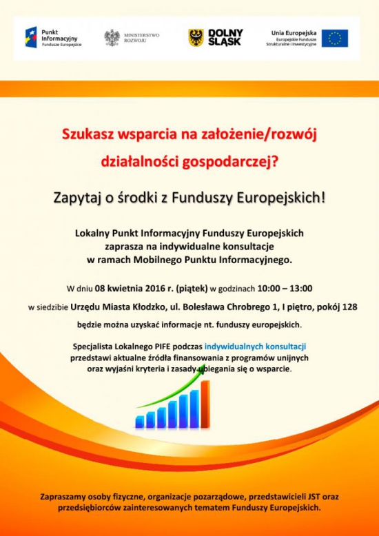 Lokalny Punkt Informacyjny Funduszy Europejskich w Wałbrzychu zaprasza na bezpłatne konsultacje indywidualne w zakresie możliwości uzyskania wsparcia ze środków Unii Europejskiej w ramach Mobilnego Punktu Informacyjnego. W dniu 08 kwietnia 2016 r. w siedzibie Urzędu Miasta Kłodzko, ul. Bolesława Chrobrego 1, I piętro, pokój 128, będzie można skorzystać z bezpłatnej informacji na temat pozyskania wsparcia ze środków unijnych. Dyżur w ramach Mobilnego Punktu Informacyjnego pełnić będzie specjalista Lokalnego Punktu Informacyjnego Funduszy Europejskich w Wałbrzychu. W trakcie konsultacji będzie można dowiedzieć się, na jakie projekty będzie można pozyskać wsparcie ze środków unijnych, jakie są warunki jego otrzymania, które instytucje organizują konkursy na dofinansowanie ze środków unijnych projektów, jak zaplanowany jest harmonogram naboru, jak przebiega nabór itp. Konsultacje kierowane są do potencjalnych beneficjantów wsparcia w ramach nowej perspektywy finansowej 2014-2020 tj. dla podmiotów gospodarczych, JST oraz III sektora. Mobilny Punkt Informacyjny będzie funkcjonował w dniu 8 kwietnia 2016 r. w siedzibie Urzędu Miasta Kłodzko, ul. Bolesława Chrobrego 1, I piętro, pokój 128 w godzinach 10.00-13.00. Konsultacje są bezpłatne. Zapraszamy do udziału!