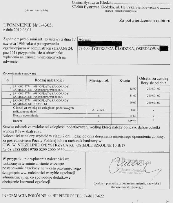WiadomościMieszkaniec Bystrzycy Kłodzkiej dostał z magistratu upomnienie. Z pisma wynika, że ma zapłacić 107 zł. To zaległości za śmieci. Problem w tym, że urzędnicy nie precyzują, kiedy mieszkaniec za śmieci nie zapłacił.