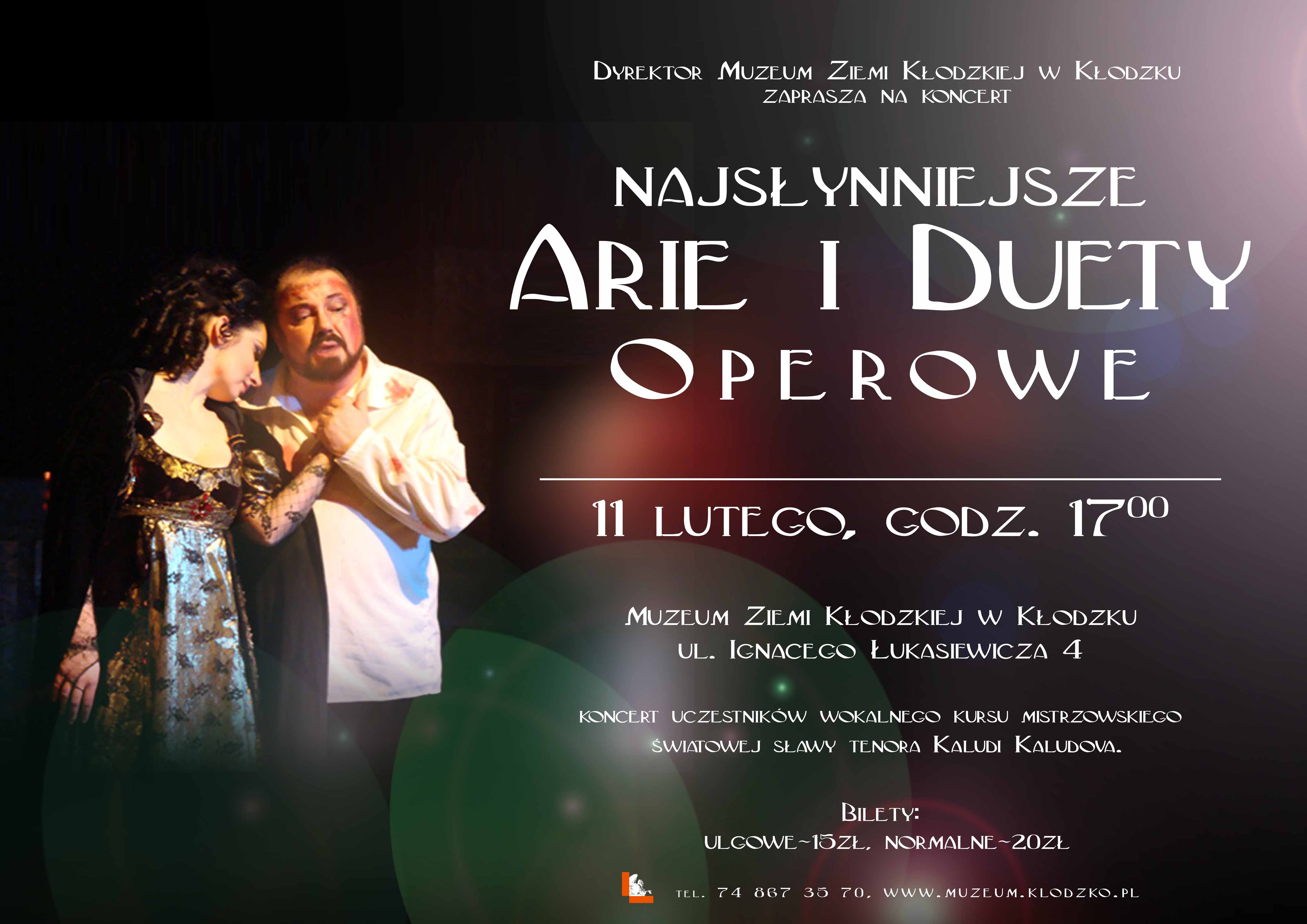 W Kursie Mistrzowskim, odbywającym się w Bystrzycy Kłodzkiej, uczestniczą śpiewacy nie tylko z Polski, lecz również z zagranicy. Warsztaty wokalne Kaludi Kaludowa prowadzone są nie tylko w Polsce, ale i w całej Europie. Tenor występuje na najważniejszych scenach operowych. Zadebiutował w Operze Wiedeńskiej rolą Alfreda w Traviacie G. Verdiego. Na scenie możemy usłyszeć go jak wykonuje partie tenorowe z oper Giacomo Pucciniego czy Georgesa Bizeta. W programie usłyszymy najsłynniejsze Arie i Duety Operowe Bilety do nabycia w recepcji muzeum: ulgowe - 15 zł, normalne - 20 zł Szczegóły pod numerem tel.: 74 867 35 70 wew. 23