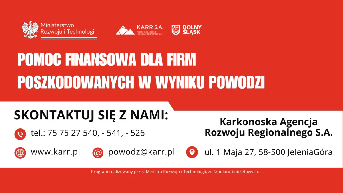 Środki pochodzą z budżetu Ministerstwa Rozwoju i Technologii i są przeznaczone dla przedsiębiorców z terenów objętych stanem klęski żywiołowej w województwie dolnośląskim. Z programu mogą skorzystać firmy zatrudniające maksymalnie 50 pracowników – zarówno mikro, małe przedsiębiorstwa, jak i jednoosobowe działalności gospodarcze.