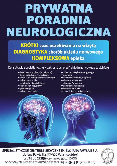 W nowej, prywatnej przychodni neurologicznej, działającej w Specjalistycznym Centrum Medycznym w Polanicy-Zdroju, przyjmuje dr Joanna Niedzielska, która od wielu lat jest członkiem Polskiego Towarzystwa Neurologicznego. - Odbyłam praktyki zagraniczne na University Hospital Carl Gustav Carus w Dreźnie. Cały czas systematycznie uczestniczę w zjazdach i konferencjach neurologicznych, poszerzając swoją wiedzę o najnowsze doniesienia ze świata nauki. Dzięki czemu utrzymuję wysoki standard oferowanych usług z zakresu diagnostyki, profilaktyki oraz leczenia neurologicznego – mówi dr Niedzielska. - Każdego mojego pacjenta traktuję indywidualnie i holistycznie, co oznacza, że patrzę na człowieka całościowo, biorąc pod uwagę całokształt stanu zdrowia fizycznego, jak również samopoczucie psychiczne. Spojrzenie holistyczne na zdrowie człowieka, to traktowanie go jako integralną całość, a nie jedynie wycinek wymagający szczególnej uwagi, np. chory kręgosłup – dodaje pani neurolog. Całościowe ujęcie zdrowia człowieka zakłada, że sfera fizyczna bezpośrednio oddziaływuje na sferę psychiczną i odwrotnie. O ile pierwsza relacja nikogo nie dziwi, bo każdy wie, że złe samopoczucie fizyczne wpływa negatywnie na stan psychiczny, jakość życia i zadowolenie z niego; o tyle druga zależność niestety dla wielu osób nie jest jeszcze tak oczywista. - Tymczasem faktem jest, że złe samopoczucie psychiczne, zwłaszcza długotrwałe lub występujące w intensywnych epizodach, negatywnie wpływają na zdrowie fizyczne i zaburza pracę poszczególnych układów i organów, dając konkretne objawy somatyczne – przestrzega dr. Niedzielska. - Brak higieny psychicznej i dbałości o tę sferę, może doprowadzić do wystąpienia chorób odstresowych, które są bardzo trudne w leczeniu, a potrafią znacząco uprzykrzyć życie codzienne (np. zespół jelita drażliwego) – dodaje. Neurolog jest w stanie sprawnie i szybko zdiagnozować, czy pojawiające się dolegliwości stanowią zagrożenie dla zdrowia. Warto zadbać o swoje zdrowie.