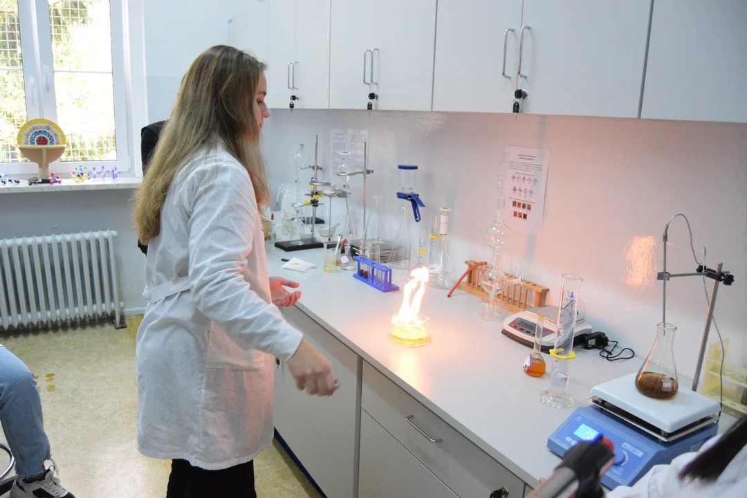 Uczniowie pod czujnym okiem nauczycielki chemii, pani Eweliny Dawid, przygotowali pokaz kilku efektownych reakcji chemicznych. Był m.in. gęsty dym, ogień, a nawet tzw. "sztuczna krew".