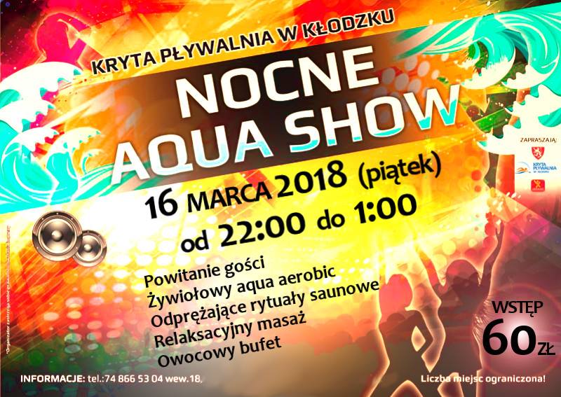 Dnia 16 marca (piątek) na Krytej Pływalni w Kłodzku odbędzie Nocne Aqua Show! Impreza startuje o godzinie 22:00 i potrwa aż do 1:00. W planie imprezy jest 45min aqua aerobiku z wykwalifikowanymi instruktorami aqua fitness, rytuały saunowe (aromaterapia oraz piling na ciało), owocowy szwedzki stół i UWAGA - wisienka na torcie czyli relaksacyjny masaż. Z takich atrakcji można skorzystać za jedyne 60zł.