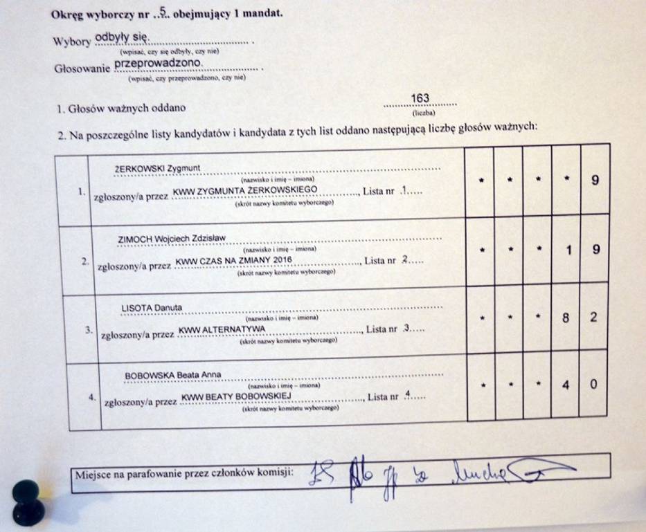 Wybory w okręgu wyborczym nr 5 ogłoszono po tym, jak zmarł wybrany w 2014 roku na radnego Tadeusz Kmiecik. Okręg nr 5 obejmuje ulice pl. Jedności, ul. Krasińskiego, Lutycka, Mickiewicza, Norwida, Rzepichy, Słowackiego, Żeromskiego. O wybór walczyło aż pięciu kandydatów. Przeważającą ilością głosów wygrała Danuta Lisota, która w poprzednich wyborach miała drugi wynik. 3 lipca głosowały na nią 82 osoby. Druga była Beata Bobowska z 40 głosami, trzeci Wojciech Zimoch z 19 głosami, Andrzej Kucab z 13 i Zygmunt Żerkowski z 9. Oddano 163 ważne głosy. Lisota startowała z KWW Alternatywa. Związana jest ze środowiskiem lewicowym. Nowej radnej już w poniedziałek, 5 lipca gratulacje na Facebooku złożył burmistrz Michał Piszko.