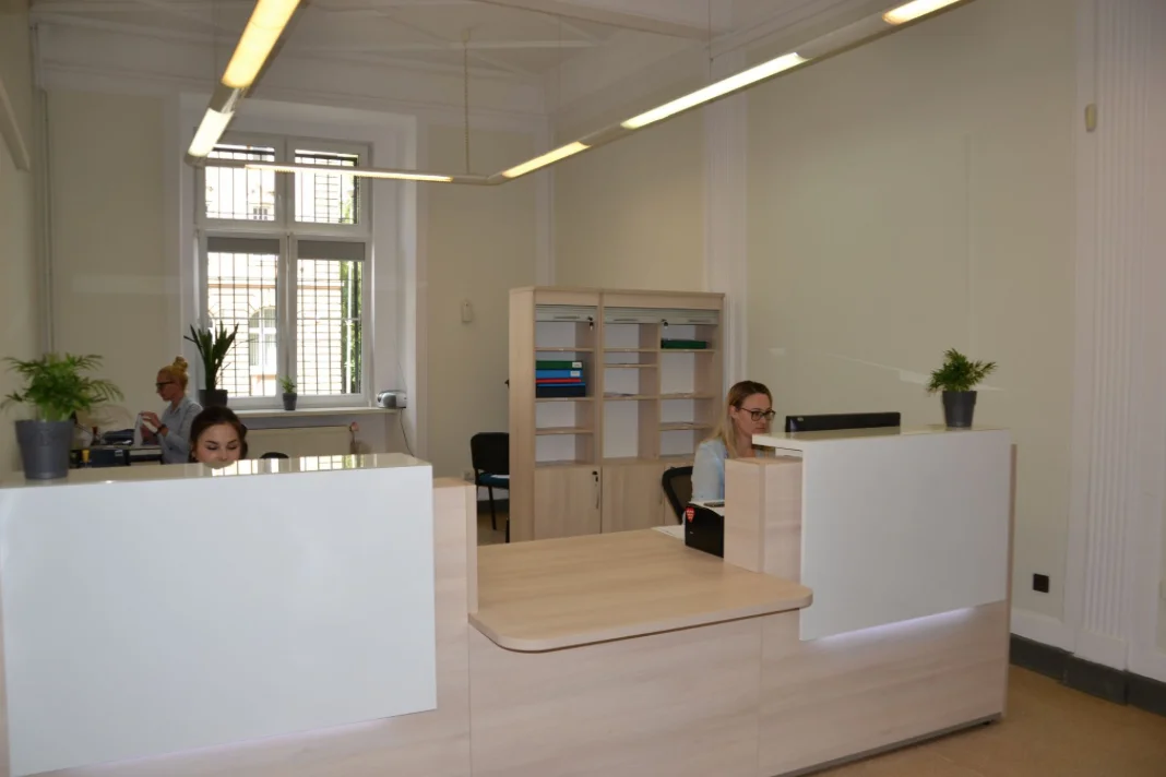 Duże, jasne pomieszczenie biurowe wraz z nowoczesnymi meblami przyczyniły się do wysokiej estetyki tego miejsca, co wiąże się także, z większym komfortem podczas załatwiania spraw dla klientów jak i pracowników. Biuro znajduje się centralnym punkcie budynku na parterze, pokój nr 14.
