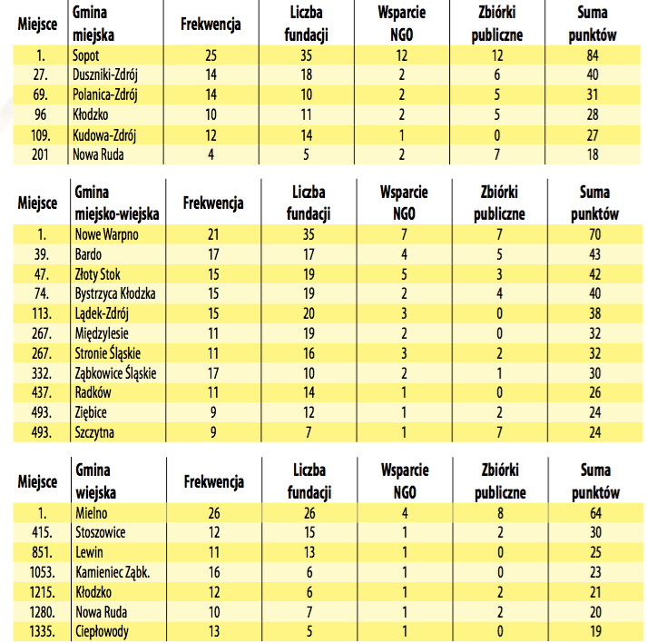 Wspólnota wzięła pod uwagę cztery wymiary aktywności społecznej. Po pierwsze aktywność obywatelską, mierzoną frekwencją w wyborach samorządowych (2014 r.) oraz parlamentarnych i prezydenckich (2015 r.). Po drugie, czasopismo podliczyło ilość organizacji pozarządowych działających w poszczególnych gminach (dla zachowania porównywalności wyników wskaźnik wyliczono w przeliczeniu na 1000 mieszkańców). Trzecim komponentem, na podstawie którego stworzono ranking było wsparcie udzielane przez samorządy organizacjom społecznym (w przeliczeniu na 1000 mieszkańców), a ostatnim elementem aktywność nieformalna, taka jak zbiórki publiczne (w przeliczeniu na 10 tys. mieszkańców). Do sporządzenia rankingu posłużył system punktowy. Każda z gmin mogła uzyskać maksymalnie 100 punktów: po 35 w kategoriach frekwencja wyborcza i sektor pozarządowy oraz po 15 w kategoriach wspierający samorząd i oddolne inicjatywy. Ranking sporządzono w pięciu kategoriach: gminy wiejskie, miejsko-wiejskie, małe miasta (do 50 tys. mieszkańców), średnie miasta (50–100 tys.) oraz duże miasta (powyżej 100 tys.). Jak wypadły gminy z powiatów kłodzkiego i ząbkowickiego, które trafiły do rankingów małe miasta, gminy wiejskie lub miejsko-wiejskie? Większość bardzo słabo. Daleko im do miana gmin naprawdę obywatelskich. Wyjątkiem są Bardo, Złoty Stok i Bystrzyca Kłodzka (gminy miejsko-wiejskie) oraz Duszniki-Zdrój (małe miasta). Te cztery gminy uzyskały łączny wynik 40 i więcej punktów