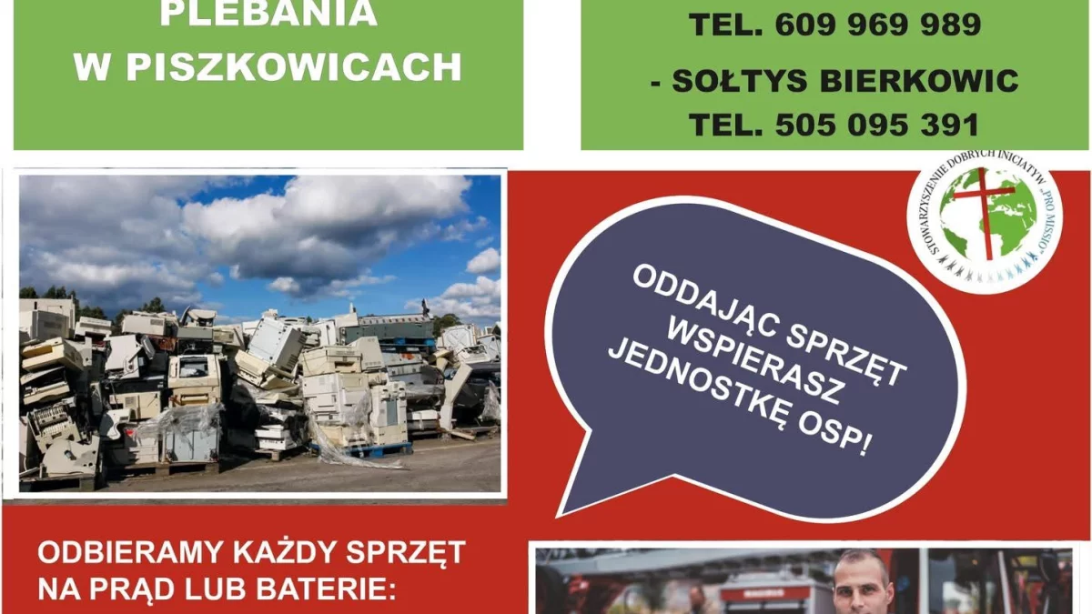 Ochotnicza Straż Pożarna w Piszkowicach ruszyła z akcją ekologiczną, w ramach której mieszkańcy mogą oddawać zużyty sprzęt elektryczny i elektroniczny. To doskonała okazja, by pozbyć się niepotrzebnych urządzeń w sposób bezpieczny dla środowiska, a przy okazji wesprzeć lokalną jednostkę OSP.