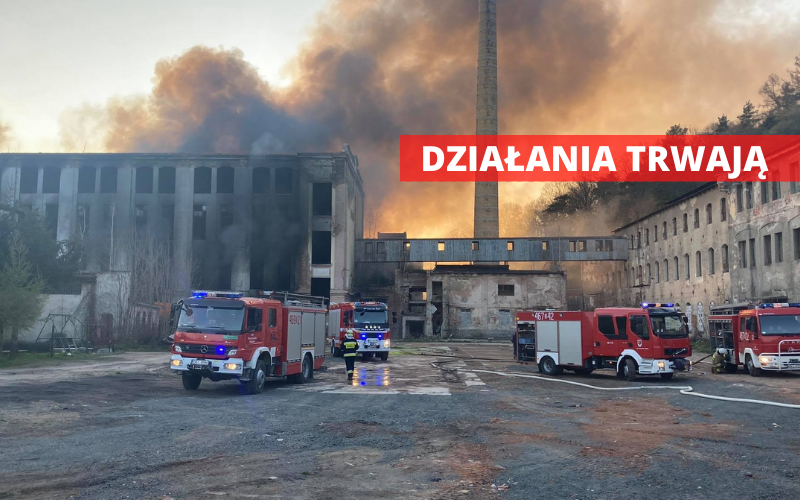 Ołdrzychowice Kłodzkie. Od wczoraj, nieprzerwanie trwa akcja gaśnicza na terenie byłego zakładu lniarskiego Lech
