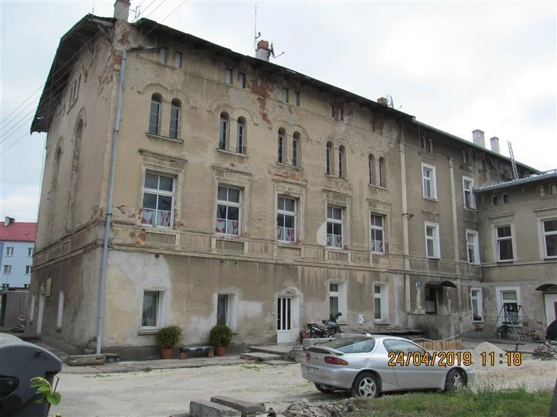 - Lokal mieszkalny na parterze – o powierzchni użytkowej 155,45 m², w stanie średnim, z dojściem od frontu i od szczytu budynku. Znajduje się w nim 6 pokoi, 3 przedpokoje, kuchnia, łazienka z WC, dwa dodatkowe sanitariaty oraz kotłownia.