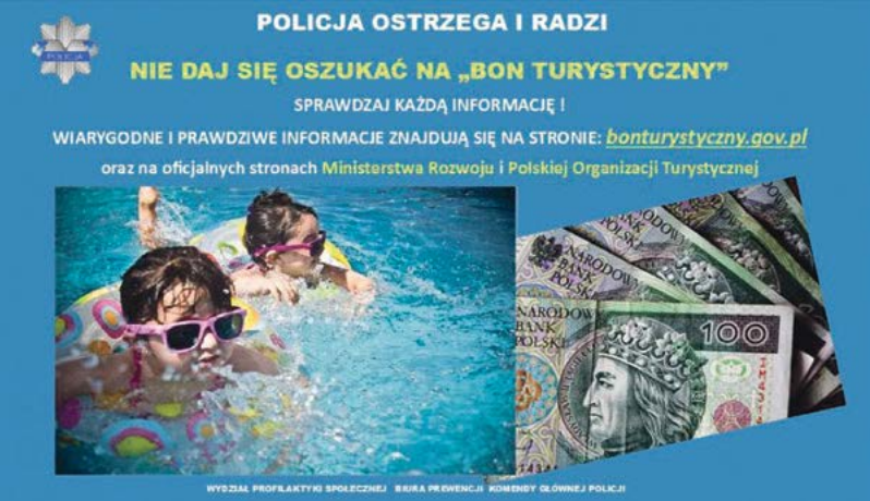 Pojawia się coraz więcej doniesień medialnych dotyczących oszustw metodą „na bon turystyczny”. Polski Bon Turystyczny to forma wsparcia finansowego polskich rodzin z dziećmi, a także krajowej branży turystycznej. Został wprowadzony przez polski rząd w związku z trudną sytuacją tego sektora wywołaną epidemią Covid-19. Przestępcy wykorzystują każdą okazję, aby wyłudzić pieniądze lub dane osobowe. Obecnie na celowniku oszustów znajdują się osoby, które mogą być rodzicami małoletnich dzieci. Sprawcy dzwonią do potencjalnych ofiar i podając się, np. za pracowników Ministerstwa Rozwoju, zachęcają do skorzystania ze „specjalnej oferty na voucher urlopowy”, informując, że warunkiem przysłania vouchera, jest wpłacenie na podane konto, pieniędzy za dodatkowe 4 dni pobytu na wakacjach (rzekomo 3 dni są za darmo w ramach bonu). Jeszcze inny „model” oszustwa opisują banki, do których docierają sygnały, że oszuści proszą o zalogowanie się na stronie internetowej i wpłatę części kosztów wyjazdu. Co więcej, mogą prosić o podanie loginu i hasła do bankowości internetowej lub danych karty płatniczej.