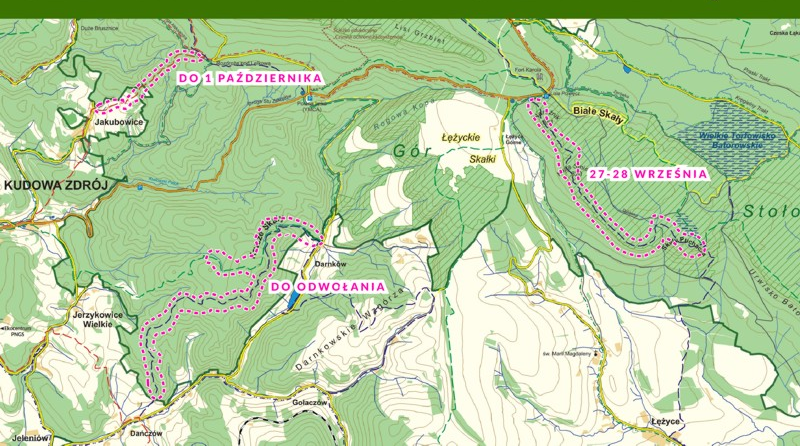 Park Narodowy Gór Stołowych zamyka kilka szlaków. 27-28 września zamknięty zostanie niebieski szlak z Lisiej Przełęczy do zielonego szlaku, a do 1 października czerwony szlak z Jakubowic do Rozdroża pod Lelkową. Do odwołania są zamknięte szlaki: niebieski oraz zielony od Dańczowa do Darnkowa. Pracownicy Parku Narodowego Gór Stołowych poinformowali także, że na obszarze Parku występują drzewa niebezpieczne. W związku ze zmianą pogody oraz częstszym występowaniem silnych wiatrów w naszym regionie, proszą o zwrócenie uwagi na prognozę pogody przed wybraniem się w teren. - W przypadku występowania silnych podmuchów wiatru, prosimy o zrezygnowanie z wędrówek szlakami przebiegającymi przez obszary leśne oraz zwracanie szczególnej uwagi na zawieszone gałęzie oraz niebezpieczne drzewa. W okresie jesiennym wielu z Państwa rozgląda się wyłącznie po runie leśnym, tymczasem niebezpieczeństwo czaić się może powyżej! Przypominamy, że na obszarze Parku Narodowego Gór Stołowych poruszamy się wyłącznie po wyznaczonych szlakach! - przestrzegają pracownicy.