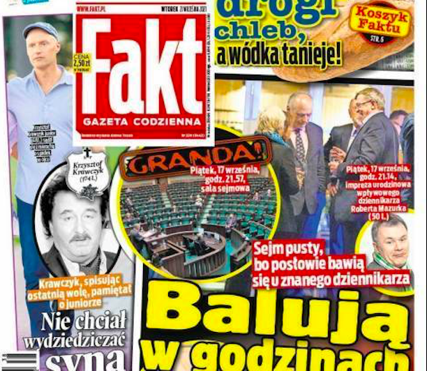 Powiat Kłodzki. Dziennik "Fakt" ujawnił, że byli na nich czołowi posłowie, którzy w tym czasie powinni siedzieć w Sejmie i słuchać raportu Mariana Banasia, szefa NIK Impreza Roberta Mazurka odbyła się w poprzedni piątek. Gościli na niej muzycy, aktorzy, kabareciarze i politycy - z różnych opcji. Obecni byli m.in. Marek Suski, Władysław Kosiniak-Kamysz, Tadeusz Cymański, Łukasz Szumowski. W tym samym czasie w Sejmie do niemal pustych ławek przemawiał Marian Banaś, szef Najwyższej Izby Kontroli. Z regionu wałbrzyskiego na urodzinach Mazurka byli trzej posłowie: Michał Dworczyk (z PiS), Tomasz Siemoniak (PO) i Marek Dyduch (SLD).