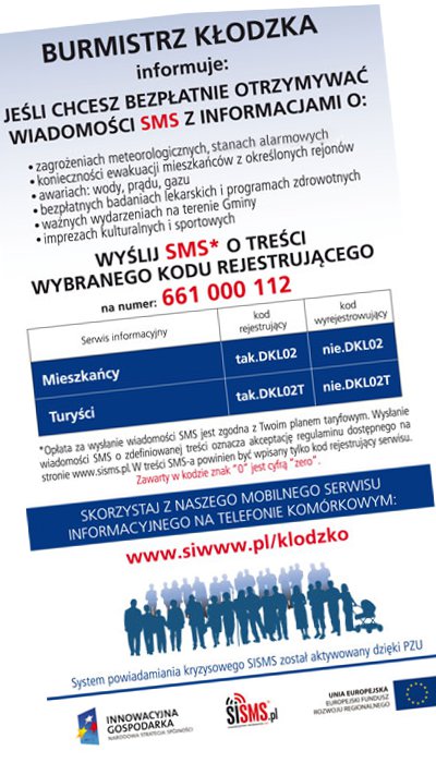 Bezpłatny serwis informacyjny SMS będzie informował Si ostrzegał nie tylko o zagrożeniach (np. klęskach żywiołowych, sinych wichurach), ale także o utrudnieniach na drogach oraz imprezach kulturalnych i sportowych. Jest przeznaczony zarówno dla mieszkańców Kłodzka jak i odwiedzających miasto turystów.
