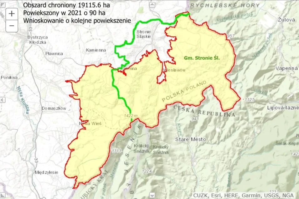 W Gminie Stronie Śląskie z tego obszaru są wyłączone jedynie: miasto Stronie Śląskie, zabudowana część Stronia Wsi, Kamienicy, Starej Morawy (zalew i okolice) oraz teren ośrodka Czarnej Góry, a więc około 70% powierzchni Gminy to obszar ochronny