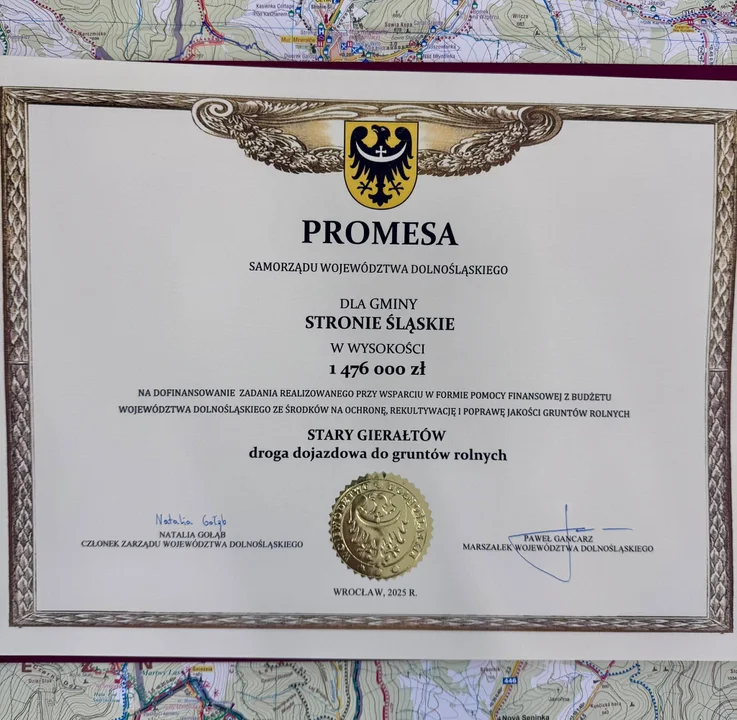 W imieniu Gminy Stronie Śląskie promesy odebrał burmistrz Dariusz Chromiec. Gmina Stronie Śląskie uzyskała dwa dofinansowania ze środków Samorządu Województwa Dolnośląskiego: