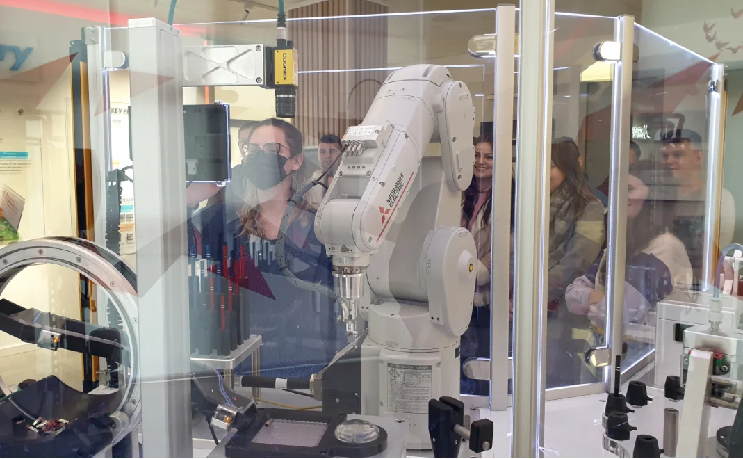 Podczas wizyty studenci zapoznali się z nowoczesnymi rozwiązaniami w zakresie automatyzacji i robotyzacji produkcji wspierającymi ideę Przemysłu 4.0. Możliwości wykorzystania robotów można było przetestować samodzielnie zlecając wykonanie produktu o zadanych parametrach na modelowej linii produkcyjnej udostępnianej przez firmę Mitsubishi Electric na potrzeby edukacyjne. Studenci ponadto mogli śledzić parametry produkcji oraz uzyskiwane efekty pracy zwizualizowane za pomocą aplikacji komputerowej.