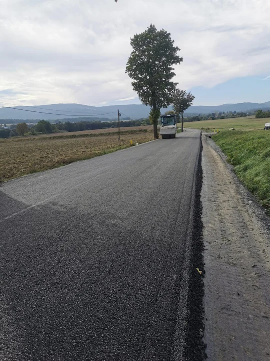 Powiat Kłodzki. Po wykonaniu poszerzeń drogi i przygotowaniu podbudowy, trwa kontynuacja układania warstwy wiążącej asfaltu na drodze Starków-Krosnowice.
