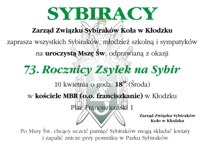 Już dzisiaj o 18.30 w kościele przy pl. Franciszkańskim 1 odbędzie się msza św. odprawiana w 73. rocznicę zsyłek na Sybir. Jej inicjatorem jest kłodzkie koło Związku Sybiraków. Po mszy uczestnicy przejdą pod pomnik w Parku Sybiraków, aby złożyć kwiaty i zapalić tam znicze.