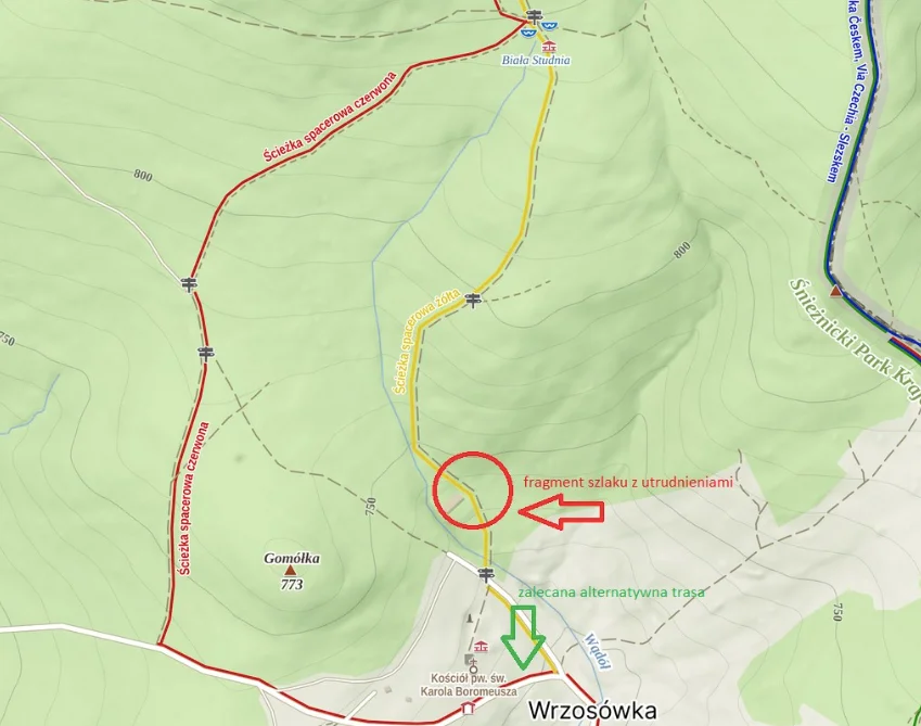 Opis: Alternatywna trasa prowadzi czerwonym szlakiem od wsi Wrzosówka (zgodnie z mapką).