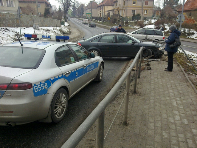 Dzisiaj ok. godz. 10. na ul. Wyspiańskiego Audi najprawdopodobniej w wyniku niedostosowania prędkości uderzył w barierę oddzielającą drogę krajową nr 33 od chodnika. Na miejsce zdarzenie przyjechała policja.